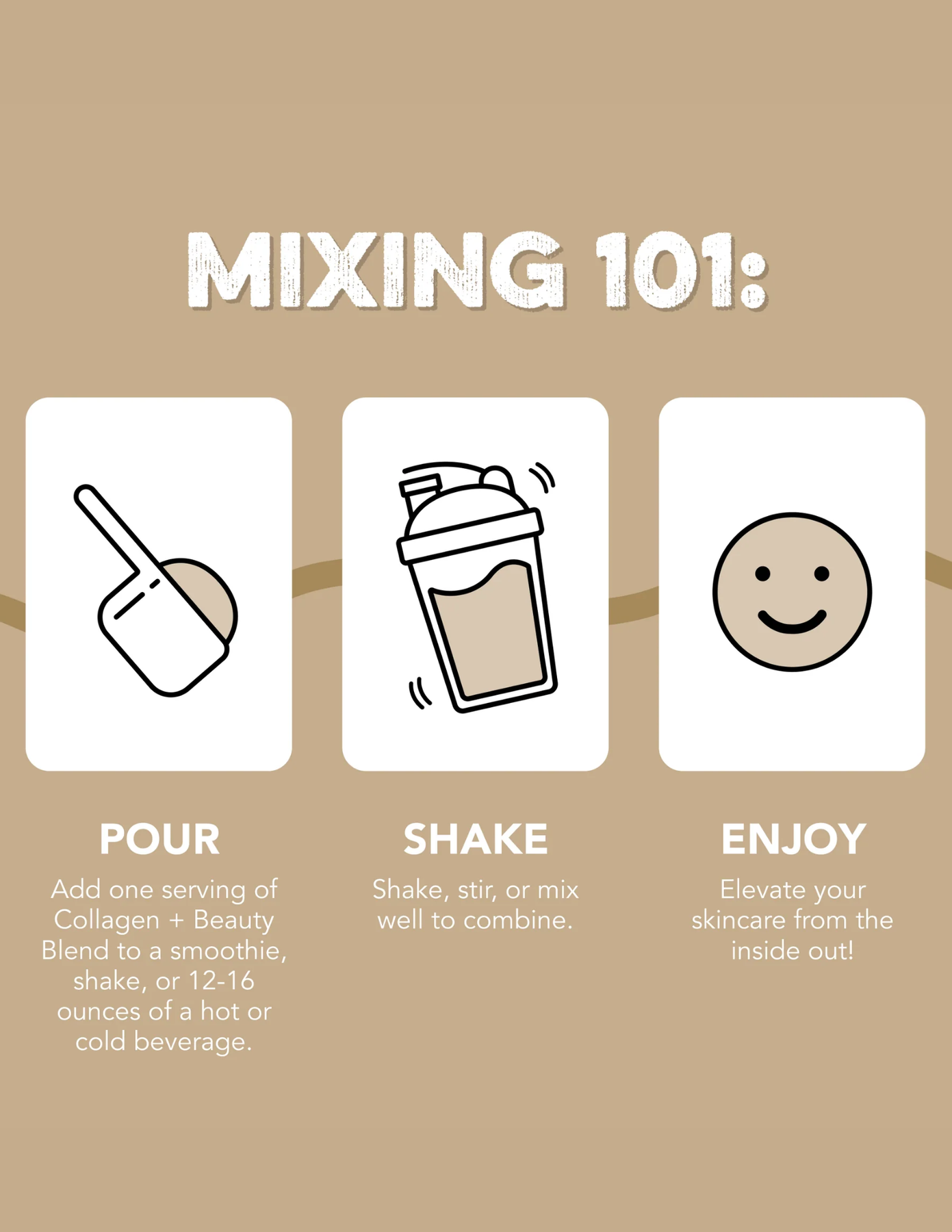 HOW TO USE: Add one serving of Collagen + Beauty Blend to a smoothie, shake, or 12-16 ounces of a hot or cold beverage of your choice. Mix well and enjoy!