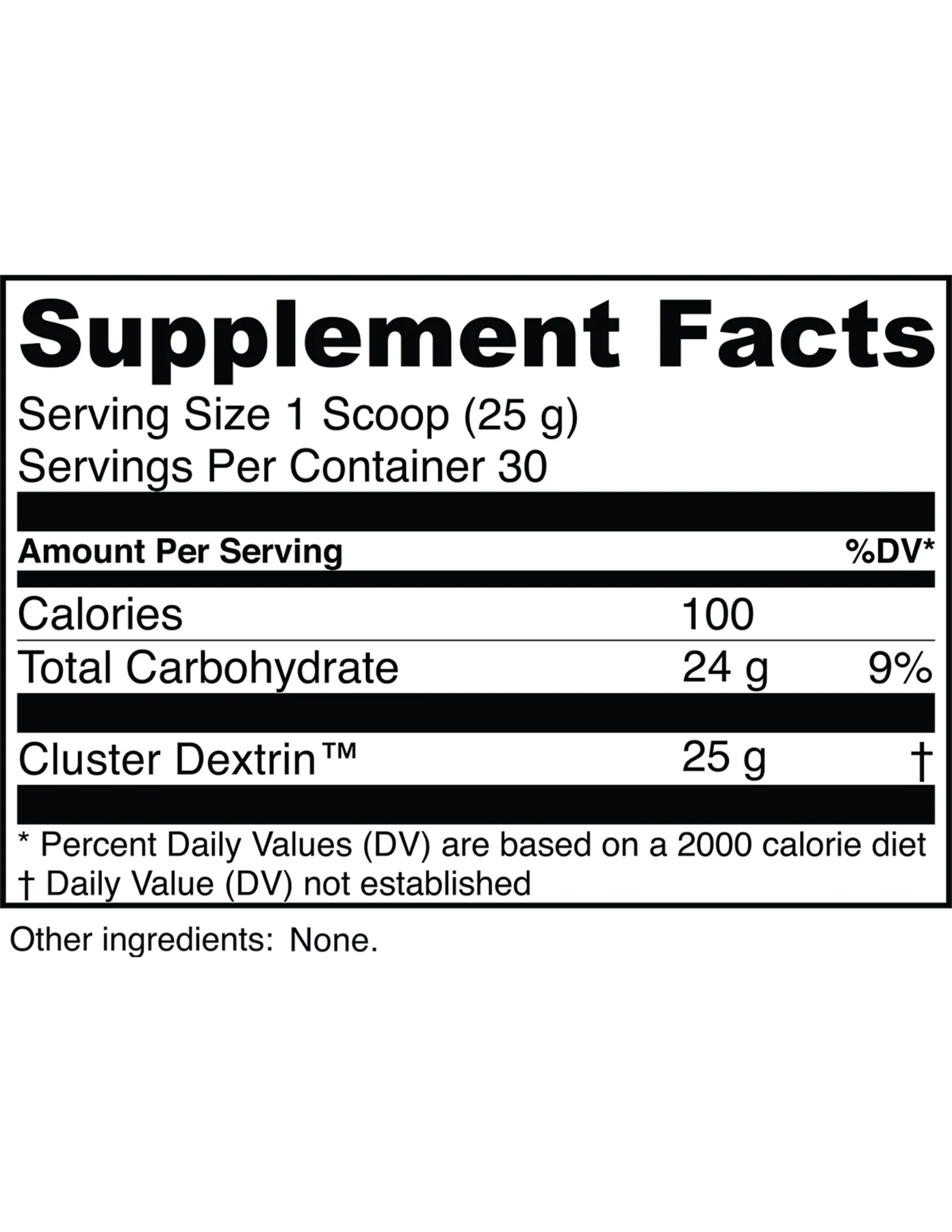 Unlike many carbohydrate powders and sports beverages, Cluster Dextrin® rapidly passes through the stomach and enters the small intestine, where it's slowly absorbed into the bloodstream. As such, Cluster Dextrin® is preferable for athletes and gym-goers since it won't cause sharp swings in blood sugar or lead to gastrointestinal (GI) distress/upset stomach.