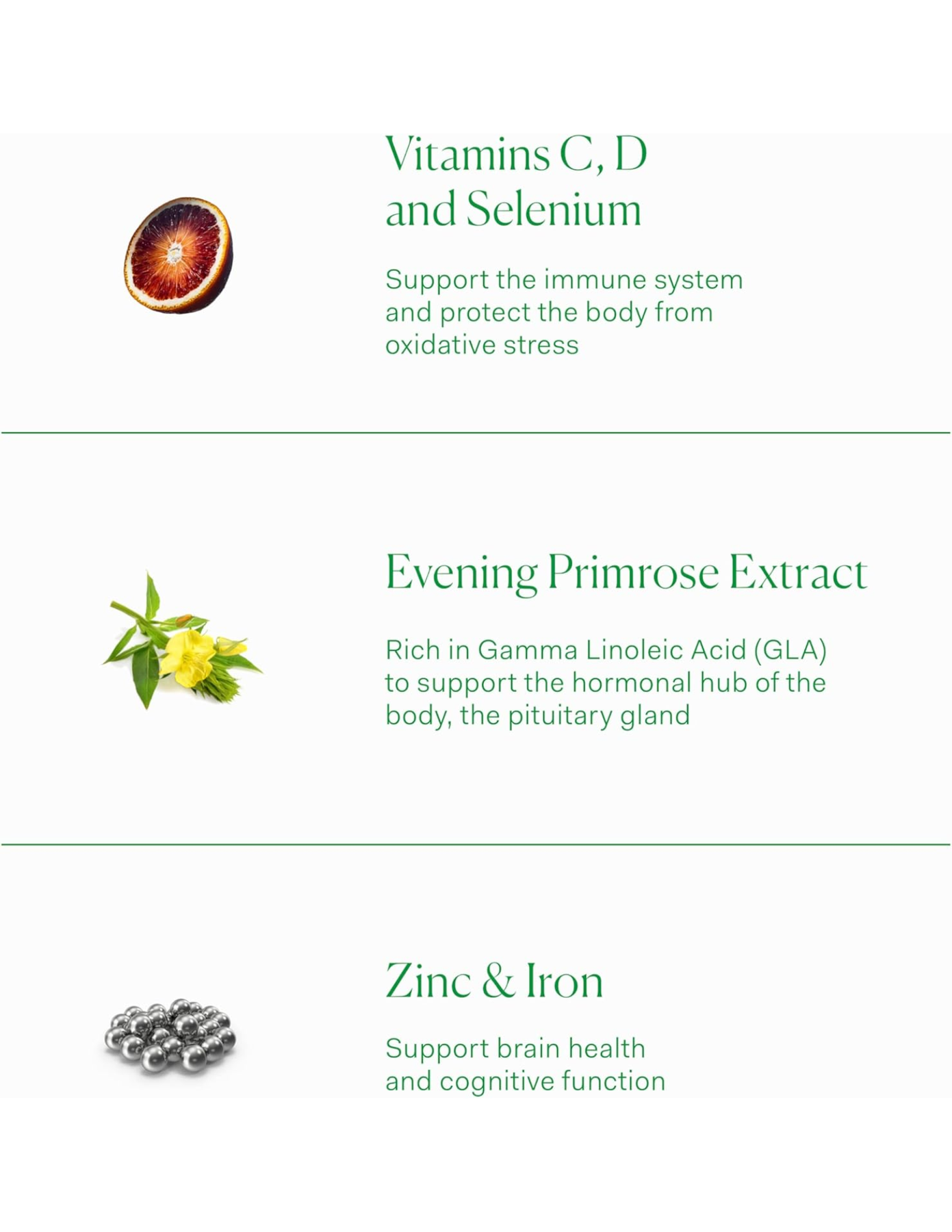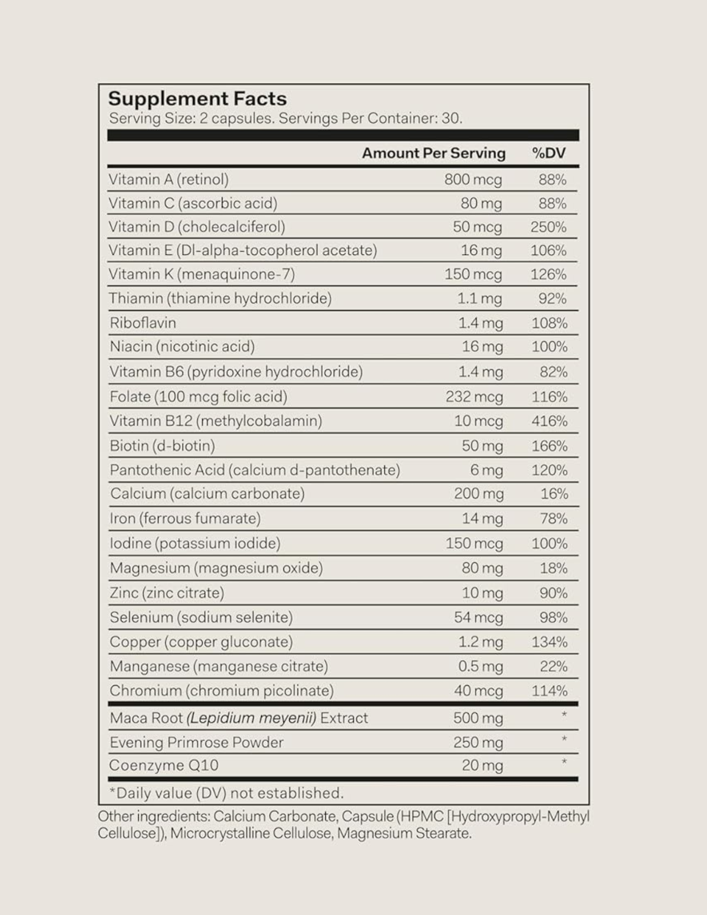 Botanicals & supportive compounds: Maca root extract, evening primrose powder, coenzyme Q10
