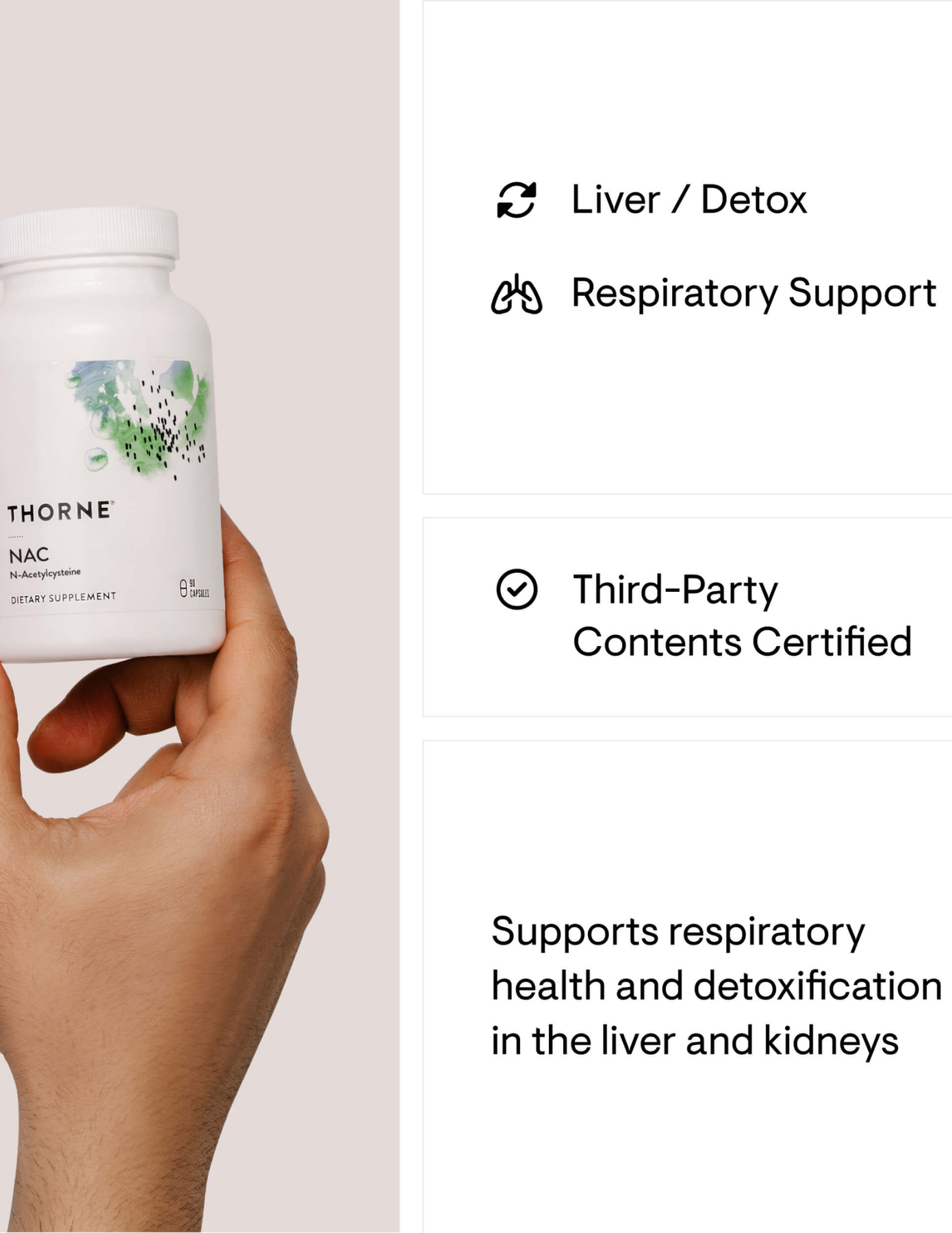 N-Acetylcysteine (NAC) is an amino acid that provides significant benefits by increasing the body’s production of glutathione and neutralizing free radicals to support detoxification.